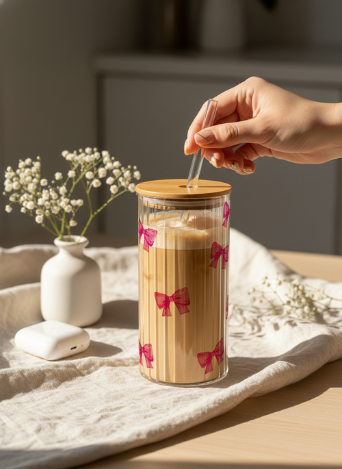 🎁 The set includes: 1N Printed Can Shaped Glass, 1N Wooden Lid, 1N Glass Straw, 1N Straw Cleaner
