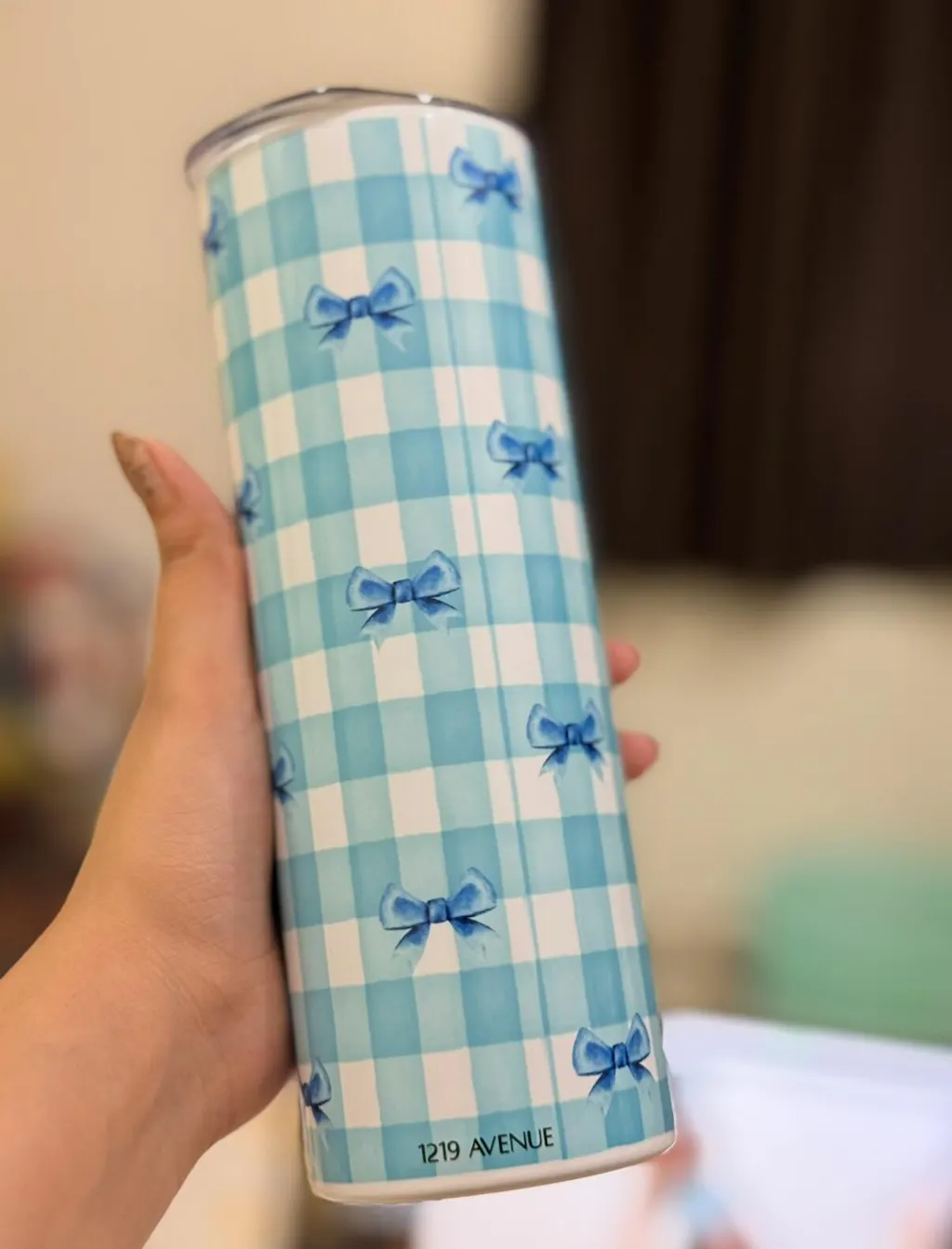 Colossal Tumbler 700ML with Straw| Blue Ghingham Bows Beauty Print |Double Walled Insulated Tumbler 7-8 hrs